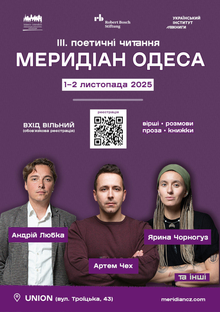 1–2 листопада 2025 року відбудуться дві паралельні великі літературні події — «Поетичні читання Меридіан Одеса» та «Поетичні читання Меридіан Миколаїв», які організовує Міжнародна літературна корпорація Meridian Czernowitz. Обидва заходи мають на меті посилити культурну присутність сучасної української літератури в містах, що є символами незламності та опору. Кожен з дводенних мистецьких заходів запропонує по 9 літературно-дискусійних подій за участі провідних постатей сучасної української літератури і культури. Meridian Czernowitz проводить фестивалі в Одесі та Миколаєві вже третій рік поспіль.