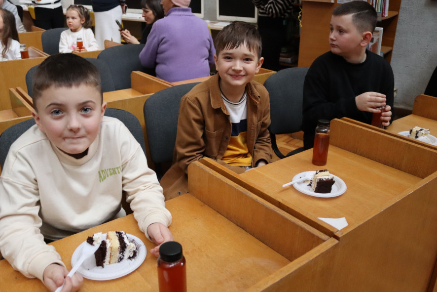 В Україні на Різдво родини готують святковий стіл з 12 пісних страв – кожна з них символізує здоров’я, добробут, любов та єдність родини: кутю, вареники, узвар та багато інших смаколиків, які дарують тепло й затишок. Тож у бібліотеці теж пригощалися – але дещо по-особливому. Дітям урочисто презентували величезний різдвяний торт, який символізує спільну радість та дитячі усмішки, бо для нас, дорослих, надзвичайно важливо бачити дітлахів щасливими. Тож юні читачі змогли сповна відчути солодку магію Різдва разом із бібліотекою. До всього кожен скуштував ще й куті з узваром.