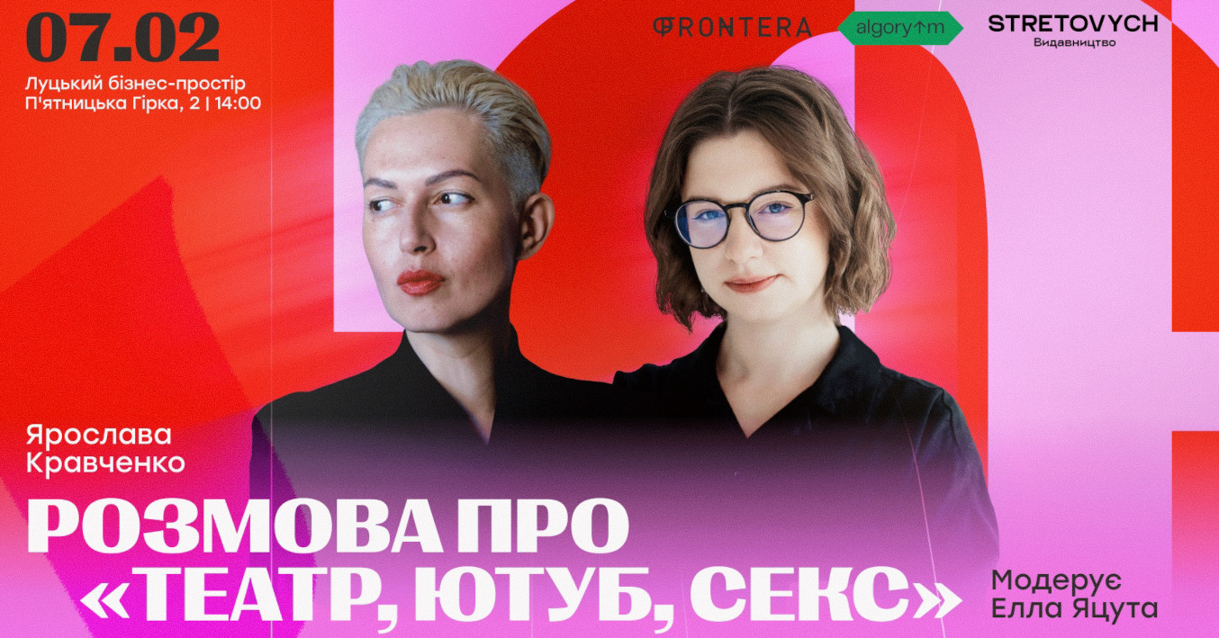 У суботу, 7 лютого о 14:00 у Луцькому бізнес-просторі (вул. П’ятницька гірка, 2) відбудеться публічна розмова «Театр, ютуб, секс» за участі авторки однойменної книжки, теле- і радіоведучої, продюсерки та громадської діячки Ярослави Кравченко. Модеруватиме подію засновниця Літературної платформи «Фронтера» Елла Яцута.