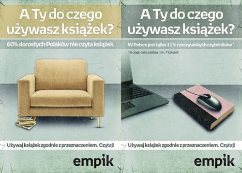 Початку акції сприяло й те, що наближається Всесвітній день книжки, у якому заклад, відповідно, бере безпосередню і активну участь. До неї випущено серію дещо провокаційних плакатів, які вже з’явилися у торговельних закладах «Емпіку». Як заявило керівництво мережі «Засобами дещо перебільшено демонстративного зображення книжок як малозначущих предметів, у ролях, які принижують їх значення, застосуванні не за призначенням, ми хочемо струснути аудиторію, а також і присоромити нечитаючих». На їх думку, над роллю книги треба замислитися, потрібне обговорення книжки в різних суспільних середовищах, серед видавців, розповсюджувачів, в інституціях, яким книга дорога, і разом з тим працювати над впровадженням планів розвитку читачівства. Ті рекламні акції, які досі привертали увагу до книги, як чудового засобу розваги, як гарний привабливий предмет, через приємне часопроведення, спокусливі заклики частіше звертатися до читання, на жаль, виявилися безрезультатними. Тому в «Емпіку» й вирішили взятися до справи, як вони гадають, радикальніше і рішучіше...