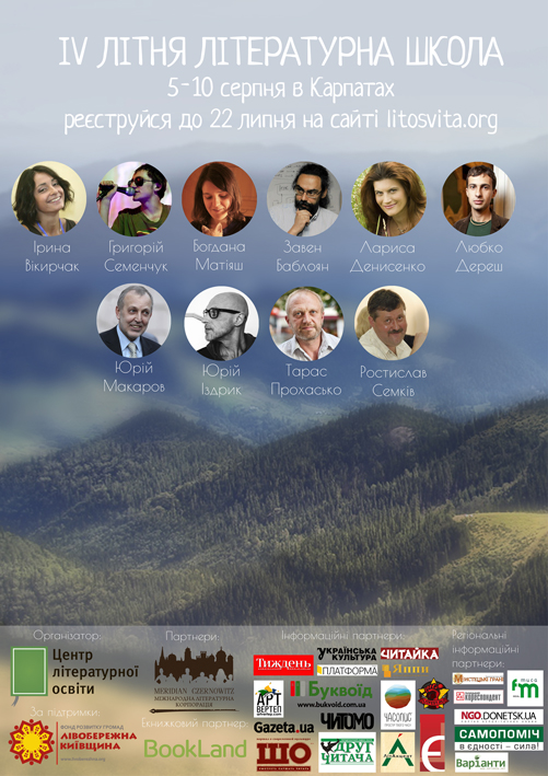 Центр літературної освіти оголошує прийом анкет на IV Літню літературну школу, яка відбудеться 5-10 серпня в Карпатах, поблизу відомого гірськолижного курорту Буковель. Для молодих письменників лекції читатимуть Юрко Іздрик, Тарас Прохасько, Юрій Макаров, Любко Дереш, Лариса Денисенко, Богдана Матіяш, Ірина Вікирчак, Гриць Семенчук, Ростислав Семків і Завен Баблоян. Реєстрація учасників триває до 22 липня включно.