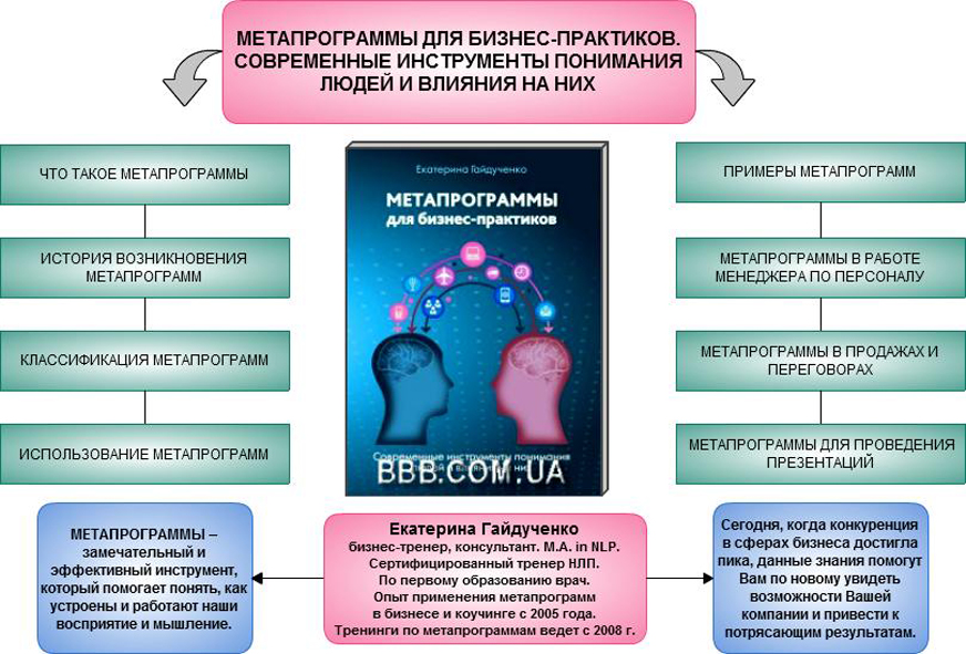 Гайдученко Катерина. Метапрограми для бізнес-практиків. Сучасні інструменти розуміння людей і впливу на них Дніпропетровськ: Баланс Бізнес Букс, 2013 - 192 с. (рос.)