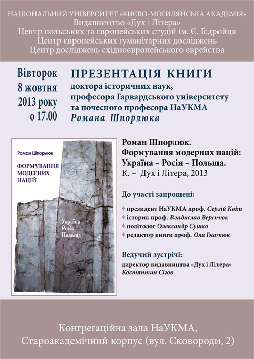 Видавництво "Дух і літера" запрошує на зустріч із доктором історичних наук, професором Гарвардського університету та почесним професором НаУКМА Романом Шпорлюком і на презентацію його книги "Формування модерних націй: Україна – Росія – Польща" (Дух і Літера, 2013).