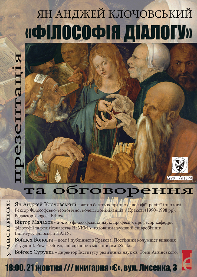 Видавництво «Дух і Літера», Інститут релігійних наук св. Томи Аквінського та Книгарня «Є» запрошують на лекцію видатного польського професора філософії, теолога, Яна Анджея Клочовського та на презентацію його книги «Філософія діалогу» (Дух і Літера, 2013), що відбудеться 21 жовтня у книгарні "Є" (м. Київ, вул. Лисенка, 3).