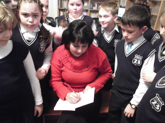 24 січня учні 4-5 класів двох шкіл – № 23 Жовтневого та № 127 Самарського районів разом зі своїми вчителями завітали до гостинної оселі щоби зустрітися з дніпропетровською письменницею Еліною Заржицькою, яка презентувала свою нову книгу «Великий Луг над Дніпром. Казки і легенди». Книга вийшла друком у видавництві «Твердиня» (Луцьк).