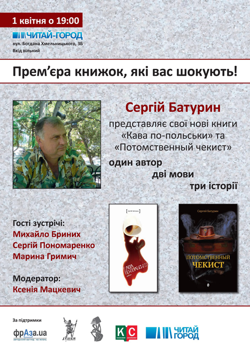 01 квітня (у вівторок) о 19:00 в книгарні «Читай-город» за адресою: вул. Богдана Хмельницького, 3Б