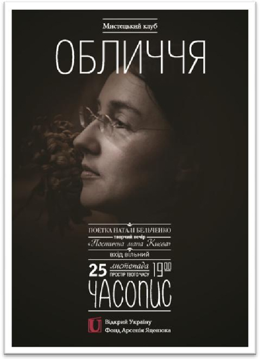 25 листопада о 19.00 в креативному просторі «Часопис» в рамках Мистецького клубу «Обличчя» відбудеться творчий вечір поетки і перекладачки Наталі Бельченко.