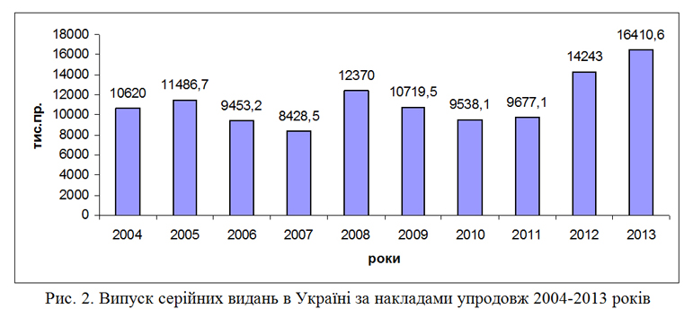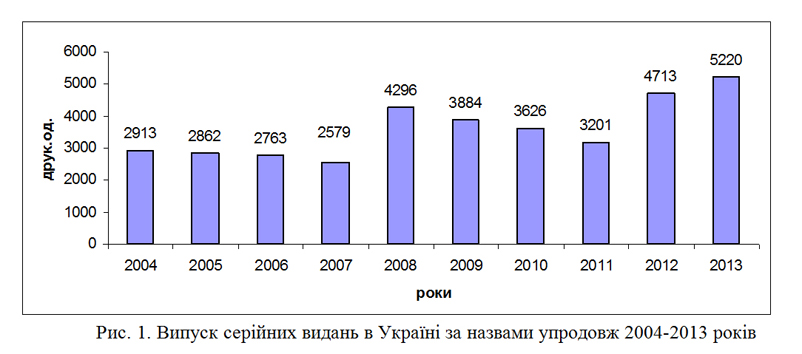 За даними Книжкової палати, упродовж останнього десятиліття випуск серійних видань в Україні коливався від 2 579 друк. од. у 2007 році до 5 220 друк. од. у 2013 році. У порівнянні з 2004 роком їхня кількість зросла у 1,8 рази, а з найпродуктивнішим докризовим 2008 роком — на 21,5 %, попереднім 2012 роком — на 10,8 % і досягла свого максимуму (рис. 1). Схожа тенденція намітилась і щодо річних накладів серійних книг. За цим показником зростання є ще вищим: у порівнянні з 2004 роком — на 54,5 %; 2008 роком — на 32,7 %, 2012 роком — на 15,2 % (рис. 2).