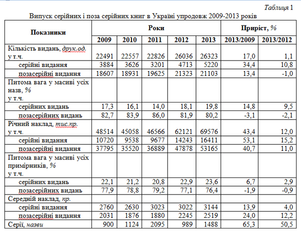 Як видно, з таблиці, випуск серійних книг скорочувався упродовж 2009 2011 років, а 2012 і 2013 роках різко зріс: на 47,2 % і 10,8 % відповідно, тоді як приріст позасерійних становив у 2012 році 8,7 %, а у 2013 році їхня кількість зменшилась на 1,03 %. Від 2010 року вихід у світ поза серійних видань поступово збільшується і у 2012 році перевищує показники 2008 року, однак лише на 6,9 %. Тобто нарощування кількісних показників українського книговидання відбулося за рахунок книг випущених у серіях, а не поза ними.