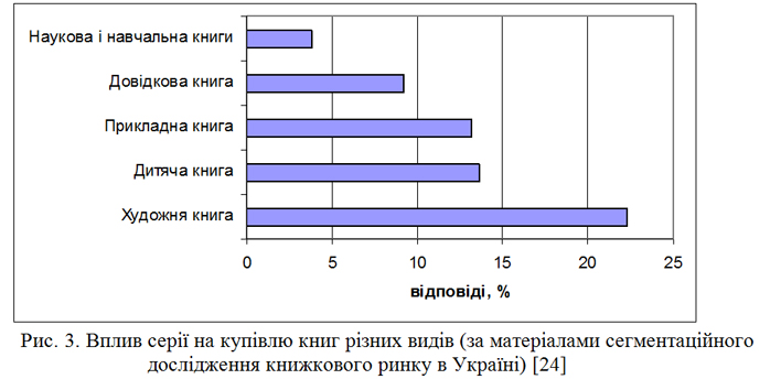 Сегментаційне дослідження книжкового ринку в Україні дає змогу з’ясувати, як впливає серія на купівлю видань різних видів. Як бачимо з рис. 3, серія має найбільше значення під час придбання літературно-художніх книг. Найменше на серію звертають увагу, вибираючи наукову і навчальну книгу, адже орієнтуються більше на рекомендації педагогів, поради друзів та прохання рідних (загалом 50,3 %), посилання іншого автора (5,0 %), назву/тему книжки (41,5 %), її зміст (24,2 %), відсутність аналогів (8,1 ) [24].
