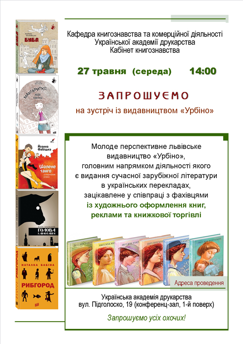 Молоде перспективне львівське видавництво «Урбіно», головним напрямком діяльності якого є видання сучасної зарубіжної літератури в українських перекладах, зацікавлене у співпраці з фахівцями із художнього оформлення книг, реклами та книжкової торгівлі