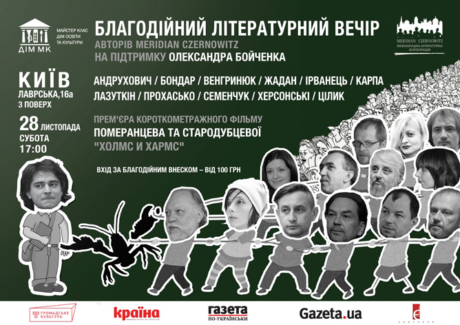 У суботу, 28 листопада о 17:00 у Домі Освіти та Культури «Майстер клас» (м. Київ, вул. Лаврська, 16 А, 3 поверх) відбудеться благодійний літературний вечір авторів Міжнародної літературної корпорації MERIDIAN CZERNOWITZ на підтримку публіциста, літературознавця і перекладача Олександра Бойченка.