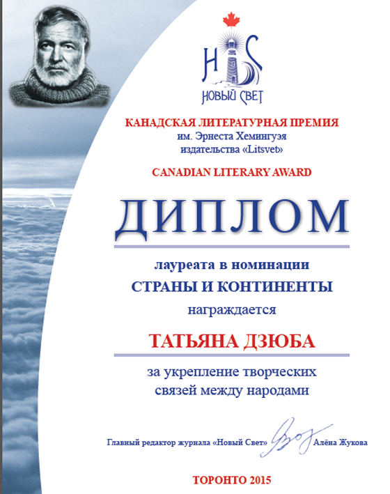 Приємна новина надійшла з Канади – відомі письменники і журналісти з Чернігова: Тетяна Дзюба (Тетяна Анатоліївна також і науковець, доктор наук із соціальних комунікацій) і наш колега з газети «Деснянська правда» Сергій Дзюба нещодавно стали лауреатами почесної міжнародної нагороди – премії імені Ернеста Хемінгуея в номінації «Країни і континенти» за зміцнення творчих зв’язків між народами.