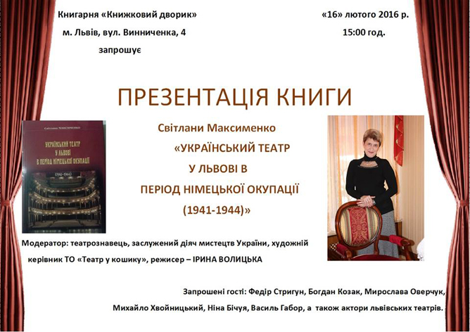 16 лютого у Львові, в книгарні "КНижковий дворик" відбудеться презентація книги Світлани Максименко "Український театр у Львові в в період німецької окупації (1941-1944 р.)