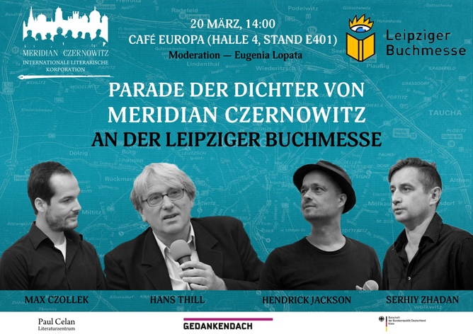 Поетичні читання «Парад поетів MERIDIAN CZERNOWITZ» на Leipziger Buchmesse відбудуться 20 березня в Café Europa, зал 4, стенд E401 з 14:00 до 15:00. Участь у заході візьмуть: Сергій Жадан (Україна), Ганс Тіль (Німеччина), Макс Чоллек (Німеччина), Генрік Джексон (Німеччина). Модератор – Євгенія Лопата.