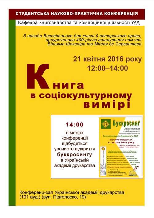 21 квітня 2016 року з нагоди Всесвітнього дня книги й авторського права, приуроченого 400-річчю вшанування пам’яті Вільяма Шекспіра та Міґеля де Сервантеса кафедра книгознавства та комерційної діяльності Української академії друкарства організовує студентську науково-практичну конференцію «Книга в соціокультурному вимірі».