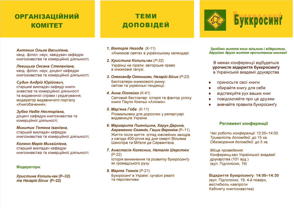 В межах конференції відбудеться також розмова про дослідження буккросинґу як громадського руху та урочисте відкриття буккросинґув Українській академії друкарства.