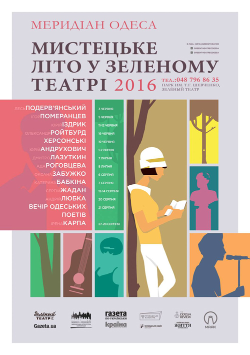 З червня по серпень в амфітеатрі «Зелёного театра» в Одесі з прозою, лірикою, авторськими лекціями та музичними імпровізаціями виступатимуть такі діячі сучасного мистецтва: Лесь Подерв’янський, Оксана Забужко, Юрій Андрухович, Ада Роговцева, Ігор Померанцев, Юрій Іздрик, Сергій Жадан, Олександр Ройтбурд, Катерина Бабкіна, Ірена Карпа, Борис і Людмила Херсонські та інші.