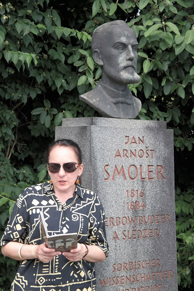 Традиційно літературні фестивалі лужичани пов’язують з ювілеєм котрогось зі своїх класиків. Відтак, під час імпрез звучать вірші видатних лужицьких майстрів слова –рідною мовою та у перекладах зарубіжних гостей. Цьогоріч святкували столітній ювілей від дня народження відомого фольклориста та етнографа, основоположника серболужицького мовознавстваі будителявендів –Яна Арношта Смолера (1816–1884).Укладена ним,спільно з Леопольдом Гауптом,збірка «Пісні верхніх і нижніх лужичан»–унікальне зібрання усної народної словесності, як за обсягом, так і фаховим коментуванням. Для відродження духовності власного народу Смолер працював також як публіцист, редактор,видавець газети«Serbske Nowiny» (яка, до слова, виходить друком і сьогодні), журналу«Łužičan», як засновник серболужицького книжкового видавництва й книгарні, один ізфундаторів «Матиці Сербської», організатор будівництва «Сербського дому» в Будишині тощо.Тексти із колекції Яна Смолера ми читали біля його пам’ятника під згуки дуди (аналог цього народного інструменту в українців –коза), який називають голосом Лужиці.Мені також випала честь покладати квіти до підніжжя монументу. Читання продовжилися і в книгарні, яка носить ім’я свого засновника. Для перекладу обрали два жартівливих чотиривірші. Один з них, у моїй інтерпретації, звучав так: