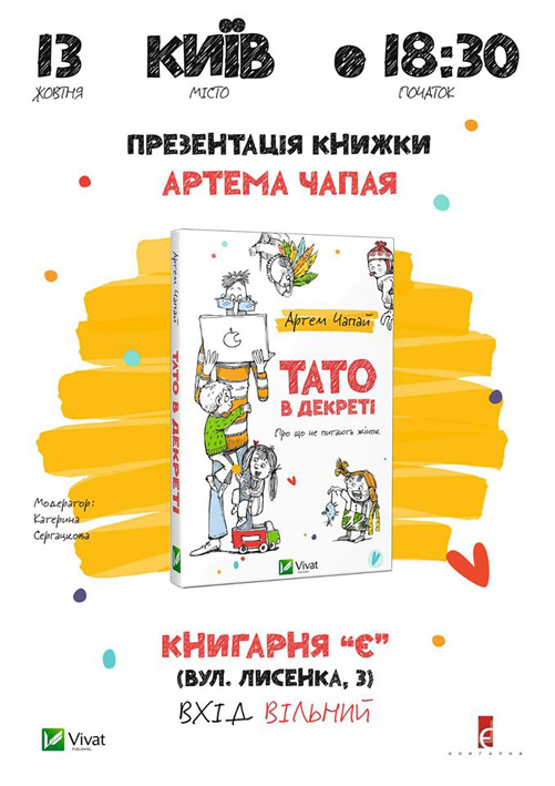 Видавництво “Vivat” та Книгарня "Є" запрошують на презентацію книжки Артема Чапая "Тато в декреті", яка відбудеться 13 жовтня о 18:30 у приміщенні Книгарні "Є" (вул. Лисенка, 3, м. Київ).