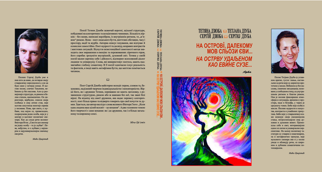 Книга «На острові, далекому, мов сльози Єви…» видана видавництвом «Арка» (Смедерево, Сербія) та бібліотекою письменників «Логос – Светови». На її сторінках ми знаходимо прекрасний приклад поетичної майстерності та спільного творчого доробку чудового подружжя двох відомих українських поетів – Тетяни Дзюби (1966) та Сергія Дзюби (1964). Книга видається у двомовній версії – українською та сербською мовами. Над перекладами віршів працював майстер своєї справи й відомий поет Рісто Василевскі. У своєму видавництві «Арка» він уже давно реалізує ідею плідної та активної міжнародної співпраці на літературних теренах.