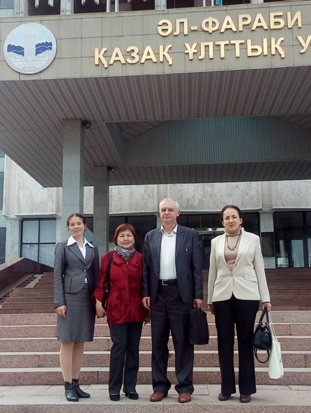 До Казахстану ми приїздили на запрошення Казахського національного університету імені аль-Фарабі. Це – найбільший і найпрестижніший вуз у цій країні. Знаходиться він в Алмати: університет – таке собі місто в місті, що займає територію близько 90 гектарів! В університеті на 15-ти факультетах навчаються 17 тисяч студентів. Нас вразили і ошатні корпуси, й мальовничі пейзажі (у студмістечку – зелено, багато троянд, бачили білочок, яких охоче пригощають і студенти, і викладачі, й гості цього дивовижного оазису).