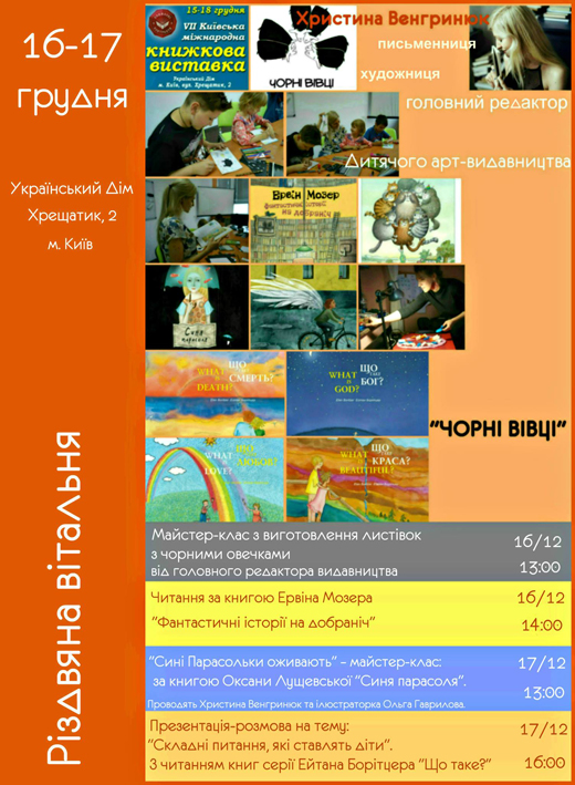 Із 15 по 18 грудня в Українському Домі (м. Київ, вул. Хрещатик, 2) триватиме VII Київська міжнародна книжкова виставка «Книжкові контракти», участь в якій візьме і головна редакторка дитячого арт-видавництва «Чорні вівці» Христя Венгринюк. Вона проведе кілька заходів для малечі та їхніх батьків: майстер-класи із виготовлення листівок, читання й презентації книжок.