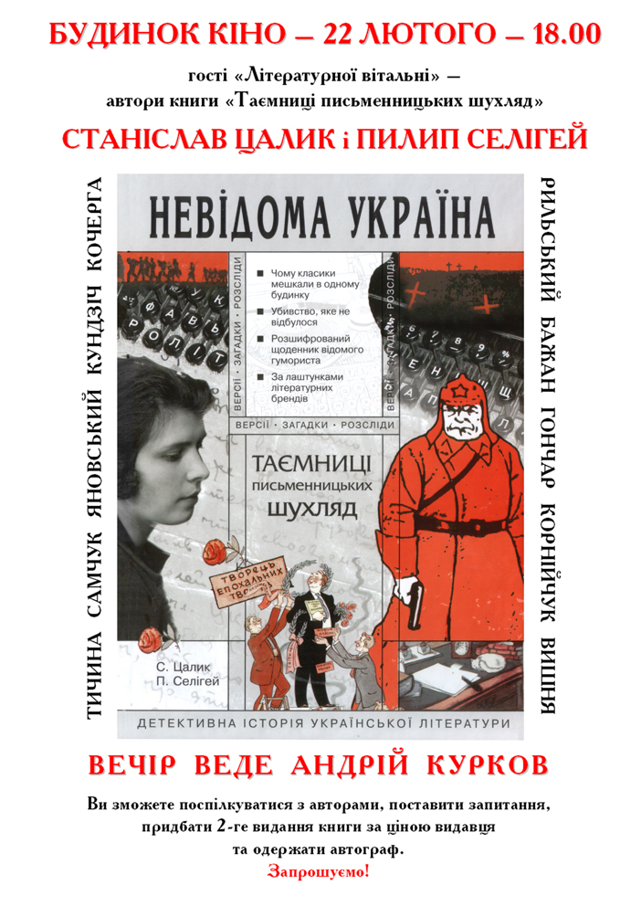 У вівторок 22 лютого о 18.00 тут гостюватимуть автори книги "Таємниці письменницьких шухляд: Детективна історія української літератури" (серія "Невідома Україна") Станіслав Цалик і Пилип Селігей. Запрошуємо усіх бажаючих поспілкуватися з авторами, придбати книгу за ціною видавця і одержати автограф за адресою: Київ, вул. Саксаганського, 6 (М "Палац Спорту").