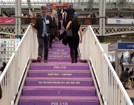 Польський виставковий стенд на Лондонському ярмарку — світлий і просторий — знаходився на другому поверсі одного з павільйонів Ярмарку і був виконаний в екостилі. Стенд приваблював живими соснами, під якими так і хотілося знайти сімейку маслюків, стендами з натуральної деревини, портретами провідних авторів, м'якими кріслами, в яких хотілось посидіти, "зачепивши по дорозі" якусь із літературних новинок, і яскравими постерами… На кількох екранах у режимі нон-стоп демонструвалися краєвиди Польщі, виступи польських авторів, трейлери інтерактивних навчальних програм та книжок. Доброзичливі усміхнені обличчя польських колег, гори духмяних, червонобоких яблук, посмакувати якими міг кожний, а головне — багато цікавих книжок, дбайливо згрупованих в експозиції за різними жанрами та тематикою.