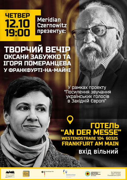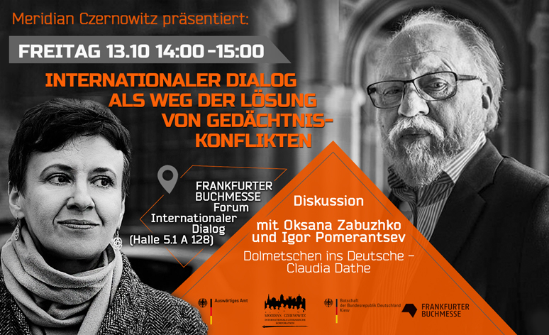 З 11 по 15 жовтня відбудеться одна з найбільших книжкових подій світу, історія якої сягає кількох століть – Франкфуртський книжковий ярмарок. Цього року вже традиційно участь в ньому візьме і Міжнародна літературна корпорація MERIDIAN CZERNOWITZ у складі письменників Сергія Жадана, Ігоря Померанцева та Оксани Забужко, а також президента корпорації Святослава Померанцева і директорки фестивалю Євгенії Лопати. Поїздка стала можливою за підтримки Міністерства закордонних справ Німеччини, Посольства Німеччини в Україні та Open Society Foundations (OSF).