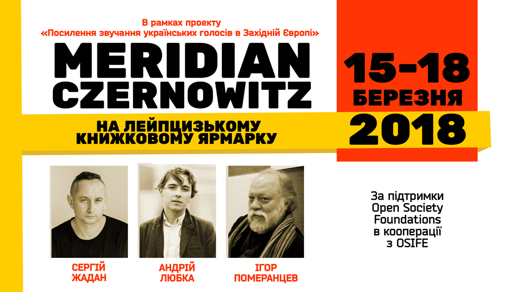 Уже всьоме участь у ній візьме і Міжнародна літературна корпорація MERIDIAN CZERNOWITZ та її автори: Сергій Жадан, Ігор Померанцев та Андрій Любка. У програмі заходів українських письменників – презентація і дискусія нового роману Сергія Жадана «Інтернат», розмова про Чернівці, читання поезії й прози, а також творчий вечір наших митців у Лейпцизі. Поїздка стала можливою за підтримки Open Society Foundations в кооперації з OSIFE та центру Gedankendach у Чернівцях.