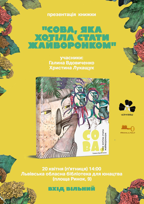 У п’ятницю, 20 квітня, о 14:00 у Львівській обласній бібліотеці для юнацтва (площа Ринок, 9) відбудеться презентація нової книжки письменниці Галини Вдовиченко «Сова, яка хотіла стати жайворонком», що побачила світ у дитячому арт-видавництві «Чорні вівці». Вхід вільний.