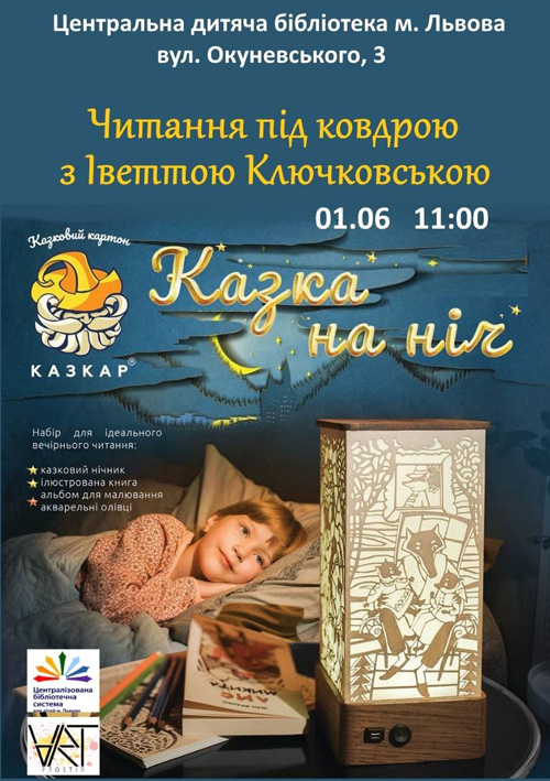 Спеціально до Дня захисту дітей відбудеться захід " Читання під ковдрою з Іветтою Ключковською". Дітки будуть читати та малювати разом з відомою львівською ілюстраторкою, а також збирати свій казковий нічник для читання.