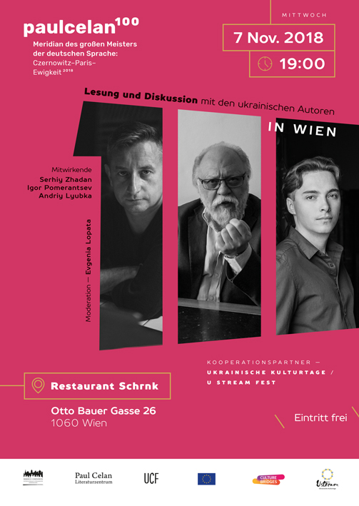 Сергій Жадан, Ігор Померанцев, Андрій Любка, Святослав Померанцев та Євгенія Лопата виступлять з презентацією проекту й дискусією про життя і творчість Пауля Целана на Віденському книжковому ярмарку, який триватиме у столиці Австрії з 7 по 11 листопада. Також упродовж ярмарку щоденно з 10 до 18 години тут діятиме стенд MERIDIAN CZERNOWITZ (Зал D, стенд № А09), де всі бажаючі зможуть отримати інформацію про корпорацію, місто Чернівці, поетичний фестиваль MERIDIAN CZERNOWITZ, ознайомитися з книжками, а також поспілкуватися з прес-секретарем корпорації Лілією Шутяк та кураторкою Літературного целанівського центру Іриною Манжос.