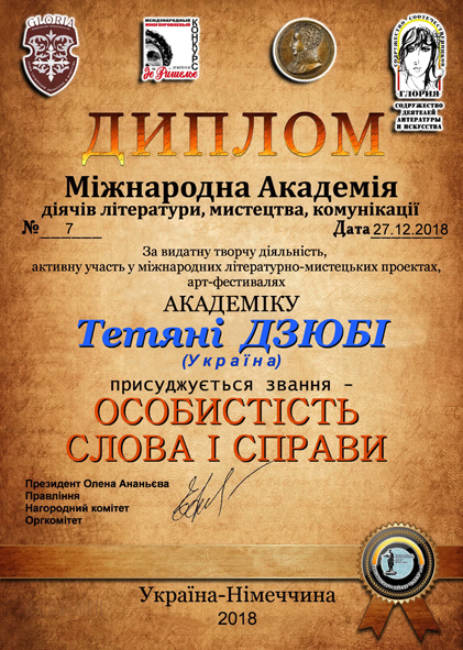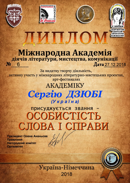 А Міжнародна Академія ЛІК діячів літератури, мистецтва та комунікацій із Німеччини (м. Франкфурт-на-Майні) та України (м. Одеса) присвоїла нещодавно письменникам, перекладачам і журналістам Сергієві та Тетяні Дзюбам шляхетне почесне звання – «Особистість слова і справи». Ці дипломи урочисто вручені в Чернігові.