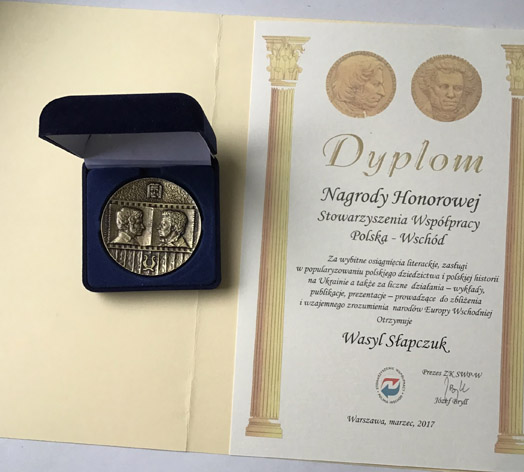 Капітула Почесної відзнаки Польського товариства «Польща-Схід» нагородила відомого українського письменника, науковця та перекладача дипломом і медаллю «Міцкевич-Пушкін» за видатні літературні досягнення, заслуги в популяризації польської історії і спадщини в Україні, а також за особистий внесок – лекції, публікації, презентації, які сприяють зближенню і взаєморозумінню народів Східної Європи.