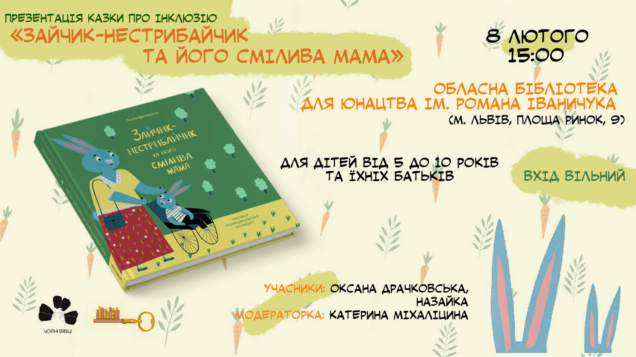 На початку лютого стартує тур чернівецької письменниці та журналістки Оксани Драчковської на підтримку її нової книжки «Зайчик-нестрибайчик та його смілива мама», що з’явилась друком у дитячому арт-видавництві «Чорні вівці». Презентації та дискусії з авторкою та її сином на тему інклюзії відбудуться в Івано-Франківську, Львові, Коломиї та Луцьку.