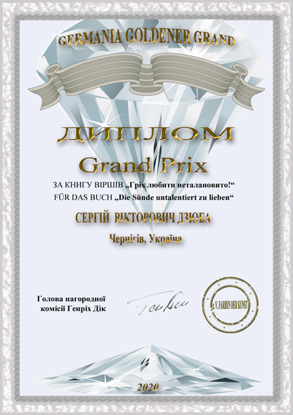 Таким дипломом «Гран-Прі» міжнародна громадська організація «Farben der Kunst», яка успішно об’єднує в Німеччині творчих людей (письменників, художників та акторів) відзначає знаних поетів із різних держав за їхні книги, котрі побачили світ у Німеччині, та видатні досягнення в літературі. Голова нагородної комісії – відомий німецький поет, прозаїк, драматург, перекладач, журналіст, видавець і громадський діяч Генріх Дік.
