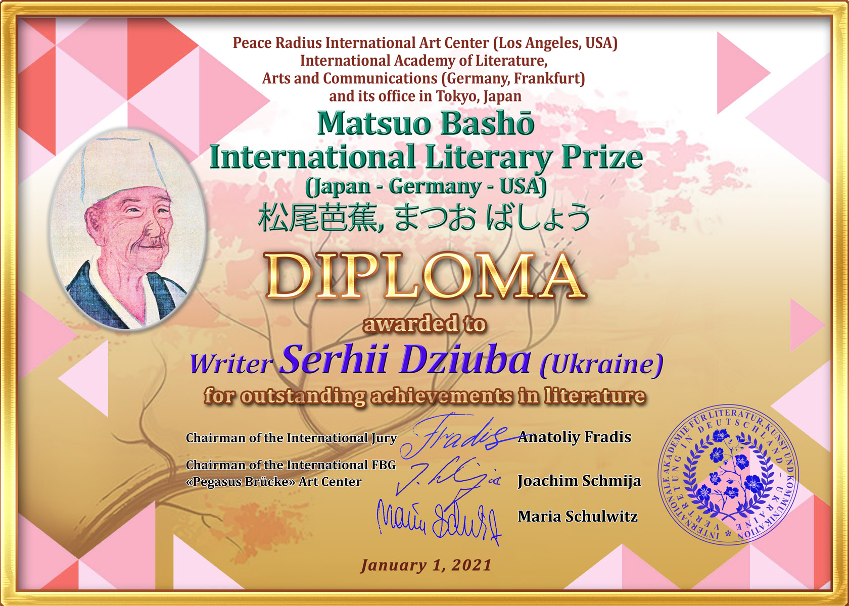 Міжнародний Арт-центр «Радіус миру» (США, м. Лос-Анджелес, голова журі – Анатолій Фрадіс), Міжнародна Академія діячів літератури, мистецтв і комунікацій (Німеччина) та її представництво в Японії (м. Токіо) оголосили лауреатів Міжнародної літературної премії імені Мацуо Басьо за 2021 рік. Також у міжнародному журі цієї почесної нагороди – і голова Міжнародного Арт-центру FBG «Pegasus Brücke» Joachim Schmija та його колега – Maria Schulwitz з Німеччини.