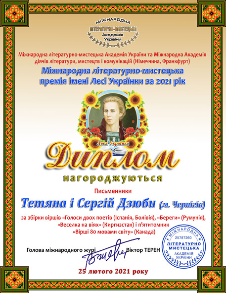 4. Письменники Тетяна і Сергій Дзюби (м. Чернігів) – за збірки віршів «Голоси двох поетів (Іспанія, Болівія), «Береги» (Румунія), «Веселка на віях» (Киргизстан) і п’ятитомник «Вірші 80 мовами світу» (Канада);