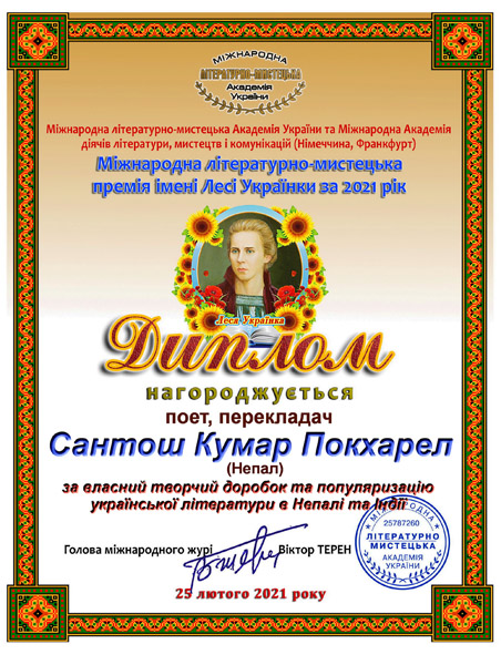7. Поет, перекладач Сантош Кумар Покхарел (Непал) – за власний творчий доробок та популяризацію української літератури в Непалі та Індії;