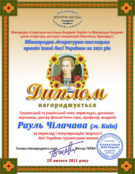 1. Грузинський та український поет, перекладач, дипломат, науковець, доктор філологічних наук, професор, академік Рауль Чілачава (м. Київ) – за переклад і популяризацію творчості Лесі Українки грузинською мовою;