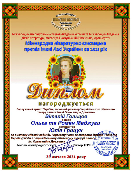 12. Заслужений артист України, головний режисер Чернігівського обласного театру ляльок імені Олександра Довженка Віталій Гольцов, актори Ольга та Роман Маджуги, композитор Юлія Грицун (м. Чернігів) – за виставу «Ласий ведмідь і Кракатунчик» за творами Михася Ткача та Сергія Дзюби в Чернігівському обласному театрі ляльок ім. Олександра Довженка.