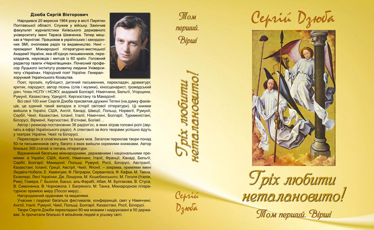 У першому томі представлені вже знані та нові вірші Сергія Дзюби, в другому будуть його переклади з різних мов, а в третьому – пародії. Ось такий цікавий проект Міжнародної літературно-мистецької Академії України та популярного чернігівського видавництва «Десна Поліграф». Крім віршів, перший том, зокрема, містить велике, ґрунтовне інтерв’ю Дмитра Слапчука з автором цієї збірки, обкладинки закордонних книг Сергія і Тетяни Дзюби та відгуки про їхню творчість відомих зарубіжних письменників.