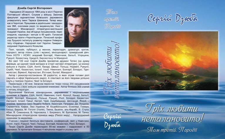 Сергій Дзюба. Гріх любити неталановито! : Вірші, переклади та пародії у 3 томах. – Том третій. Пародії. – Київ-Чернігів: Міжнародна літературно-мистецька Академія України; Чернігів: Десна Поліграф, 2021. – 520 с.