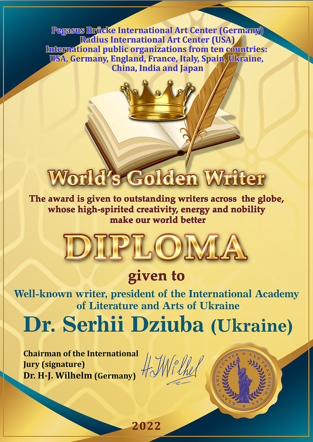 Міжнародні громадські організації з десяти держав (США, Німеччини, Англії, Франції, Італії, Іспанії, України, Китаю, Індії і Японії) заснували дуже престижну нагороду «Золотий письменник світу». Нею наразі відзначаються талановиті, відомі та успішні письменники світу, які своєю високодуховною, яскравою, шляхетною та подвижницькою творчістю пропагують гуманізм, мир, доброту, справедливість і любов, – саме ті загальнолюдські цінності, що об’єднують народи та сприяють їх розвитку і розквіту, роблять наш світ кращим.
