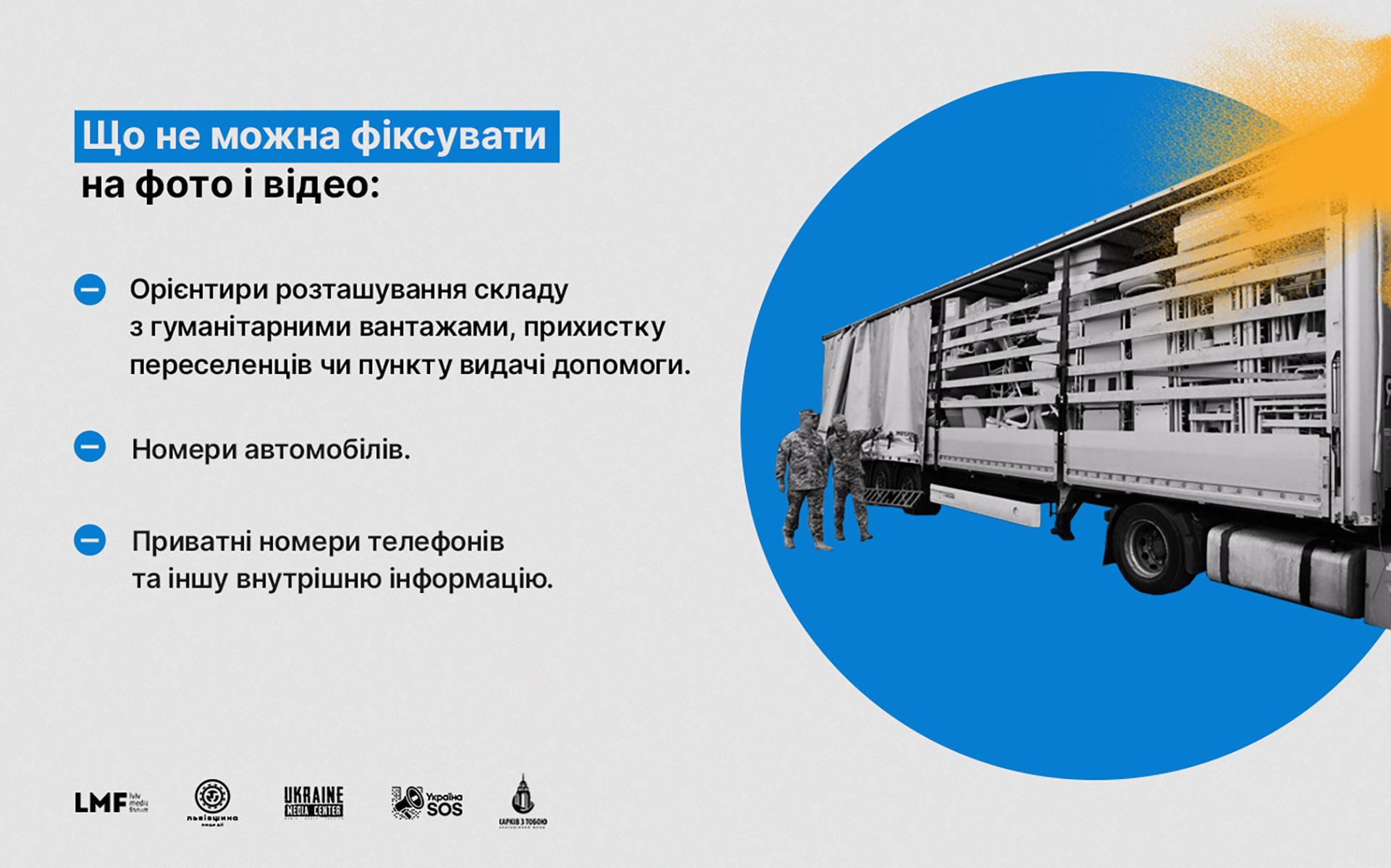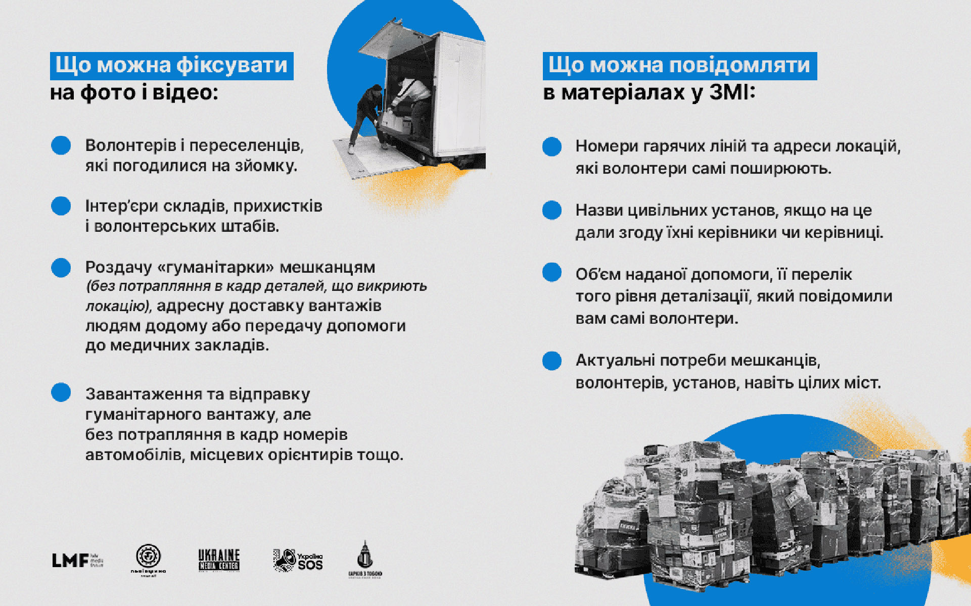 • Завантаження та відправку гуманітарного вантажу, але без потрапляння в кадр номерів автомобілів, місцевих орієнтирів тощо.