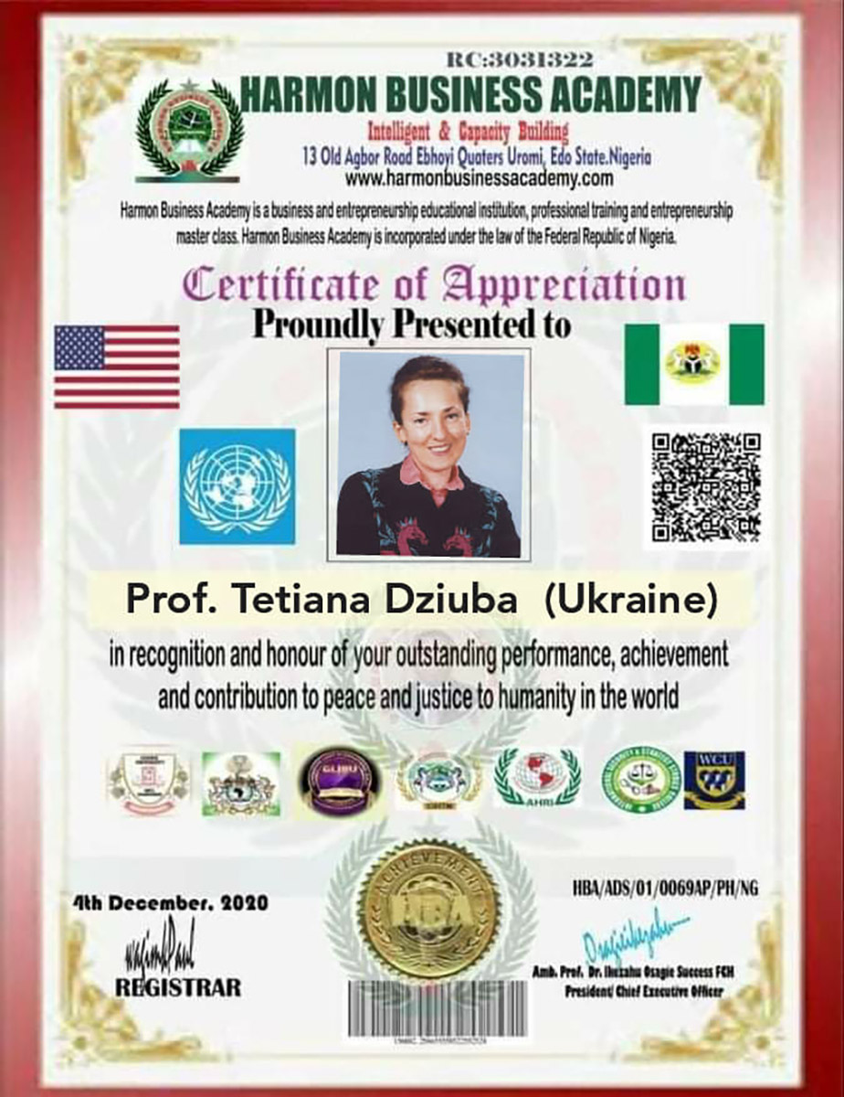 Нині їх нагородили в Нігерії. «Harmon Business Academy» вручила українцям свої міжнародні сертифікати та подяки «За видатні досягнення». Відзначено, що твори всесвітньо відомого подружжя з Чернігова перекладені вже 95 мовами і надруковані в 75 державах. Водночас Сергій та Тетяна дуже майстерно та успішно перекладають українською мовою світову класику. І у Сергія Дзюби є вже власні переклади з 70 мов. Подружжя популяризує мову, літературу, мистецтво, історію та національні традиції України по всьому світу.