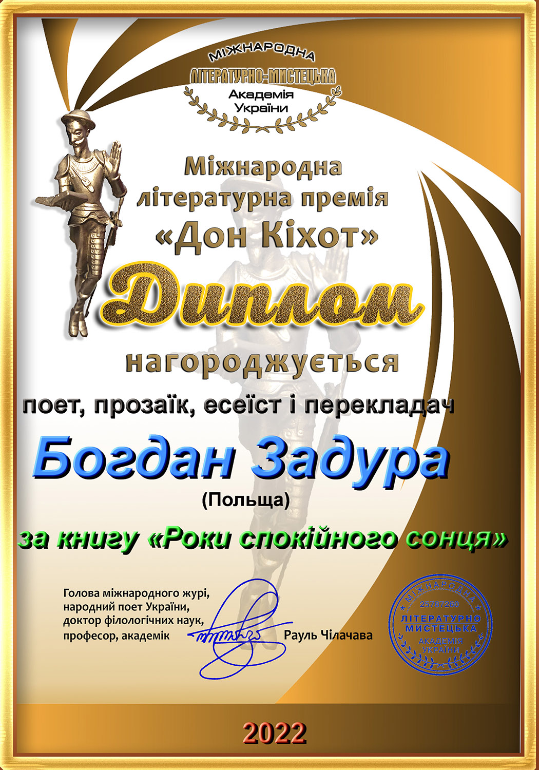 Нині міжнародне журі назвало цьогорічного лауреата Міжнародної літературної премії «Дон Кіхот». Отже, престижну нагороду отримав видатний поет, прозаїк, есеїст і перекладач Богдан Задура (Польща) – за книгу «Роки спокійного сонця».