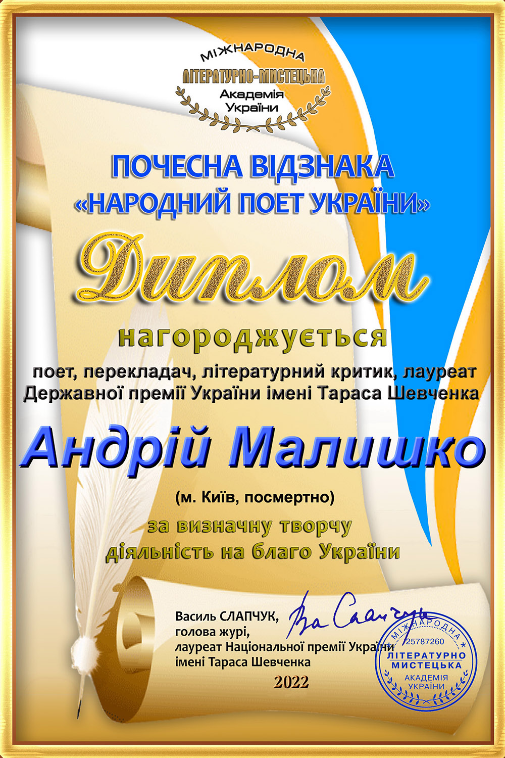 А тепер нагороджений наш видатний український поет, перекладач та літературний критик, лауреат Державної премії України ім. Тараса Шевченка Андрій Малишко (м. Київ).